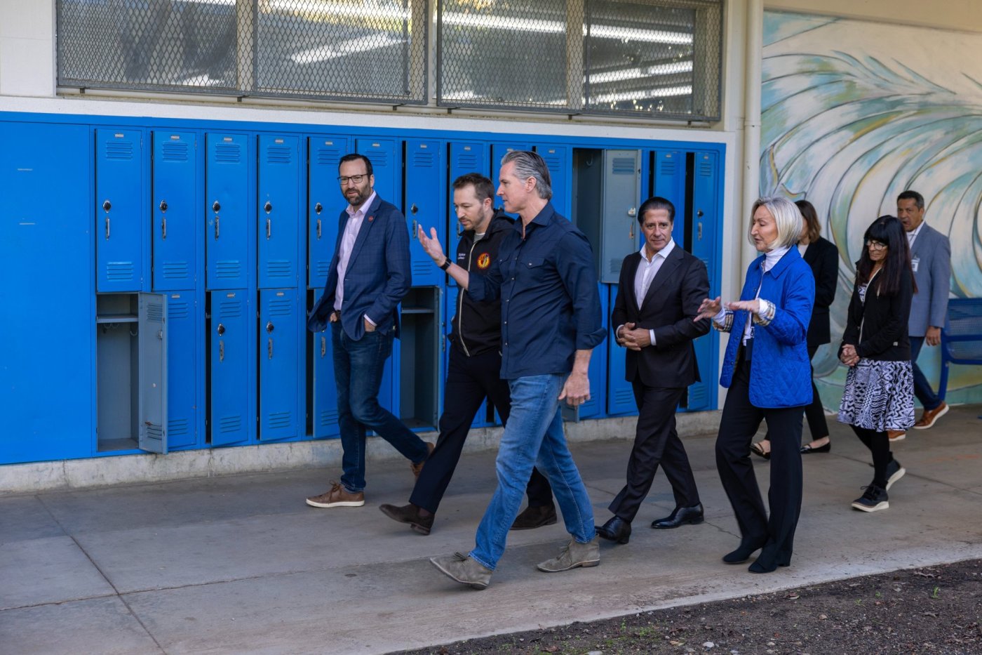 Gov. Gavin Newsom and First Partner Jennifer Siebel Newsom visited various ceremonies marking the anniversary on Wednesday, including a temporary memorial exhibit curated by the Department of Angels. They met with survivors of both the Eaton and Palisades fires and were joined by senators Padilla and Schiff.