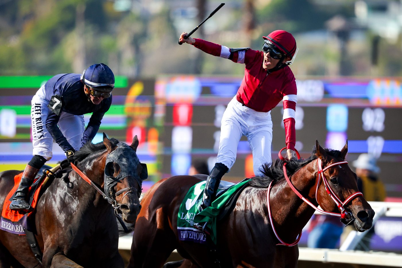 Forever Young, the Japanese-bred 5-year-old last seen in competition winning the Breeders’ Cup Classic at Del Mar on Nov. 1, tries to become the first repeat winner in the seven runnings of the $20 million Saudi Cup at King Abdulaziz Racecourse on Saturday. But he and jockey Ryusei Sakai will have to beat 5-year-old Nysos (Flavien Prat riding) and 4-year-old Nevada Beach (Irad Ortiz Jr.), the Bob Baffert-trained pair who battled to a 1-2 finish in the Laffit Pincay Jr. Stakes at Santa Anita. Fourteen horses are entered in the approximately 1⅛-mile Saudi Cup, the world’s richest thoroughbred race.