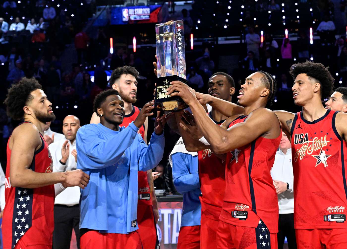 Minnesota Timberwolves guard Anthony Edwards, left, and Toronto Raptors star Scottie Barnes, right, of Team USA Stars hoist the championship trophy after defeating Team USA Stripes, 47-21, to win the 75th NBA All-Star Game on Sunday at the Intuit Dome in Inglewood. The three-team tournament was largely competitive and entertaining. (Photo by Keith Birmingham, Pasadena Star-News/SCNG)