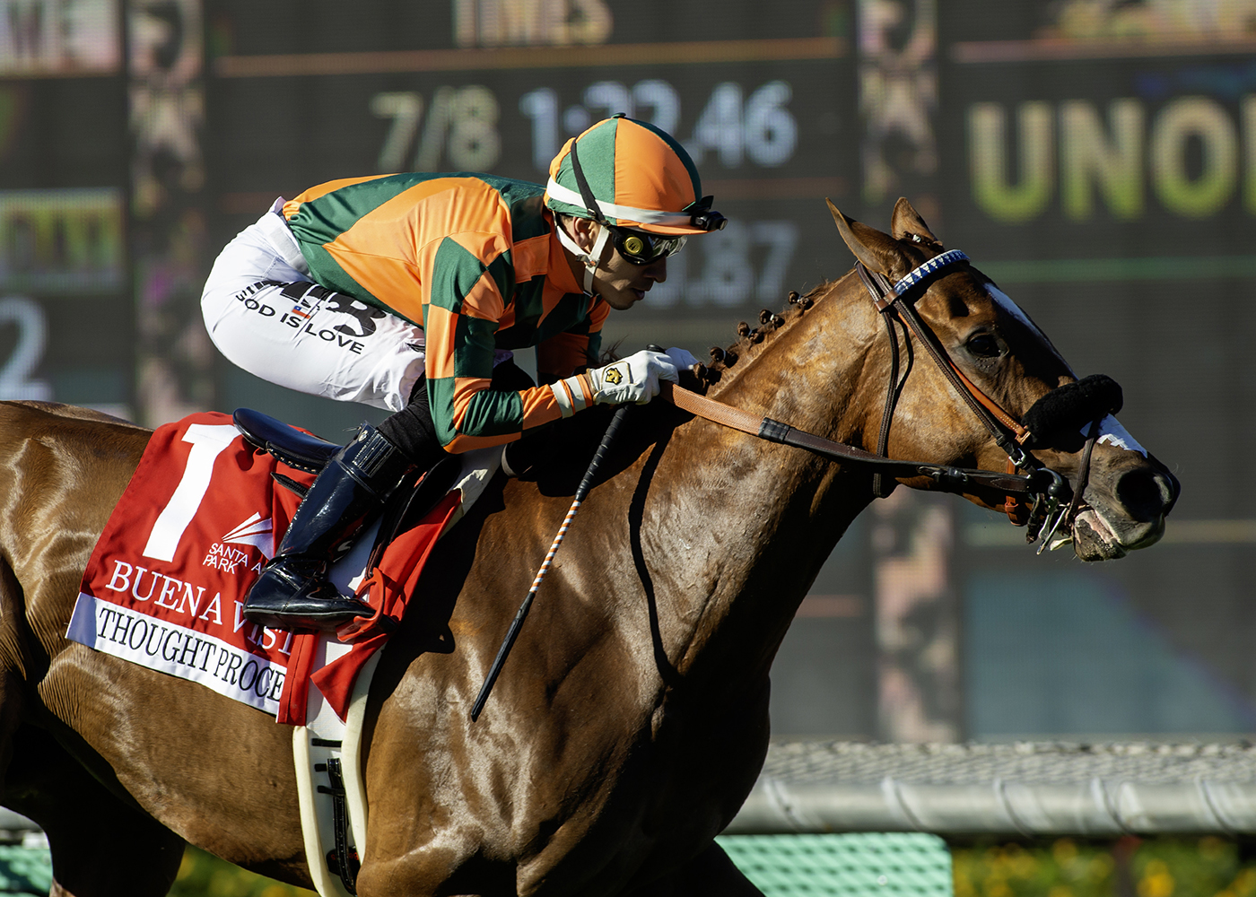 So far, so good. Back from a six-month layoff and back in form, Thought Process followed a patient ride by Hector Berrios to a two-length victory over a strong field in the $200,000, Grade II Buena Vista Stakes for fillies and mares at Santa Anita on Saturday.