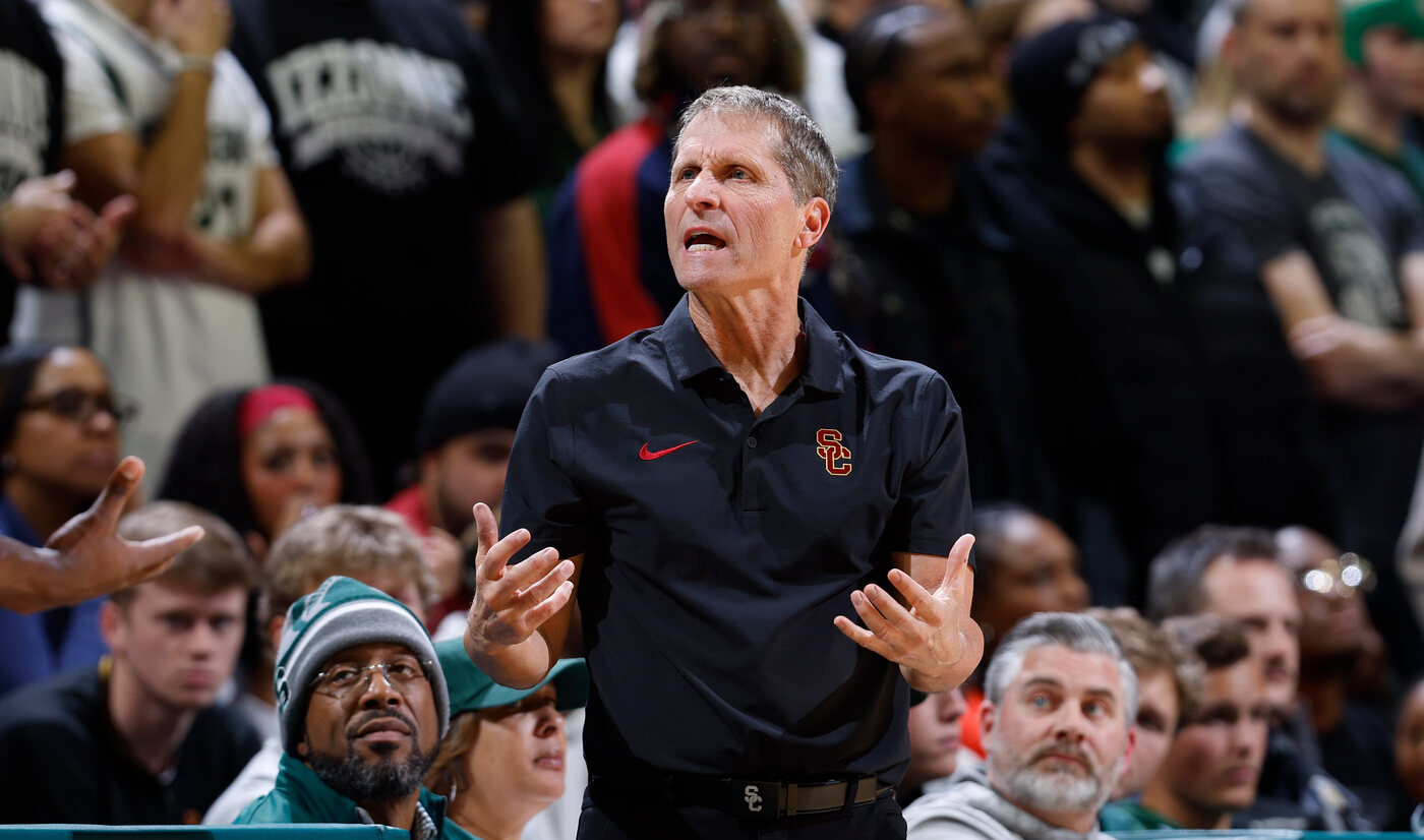 USC coach Eric Musselman reacts on the sideline during the first half of their loss to Michigan State on Monday night in East Lansing, Mich. The Trojans were blown out for the second game in a row, 80-51. (AP Photo/Al Goldis)